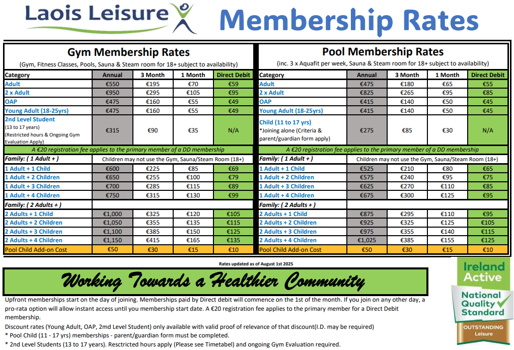 Upfront memberships start on the day of joining. Memberships paid by Direct Debit will commence on the 1st day of the month. If you join on any other date, a pro-rata option will allow instant access until your membership start date. A €15 registration fee applies to the primary member for a Direct Debit membership.